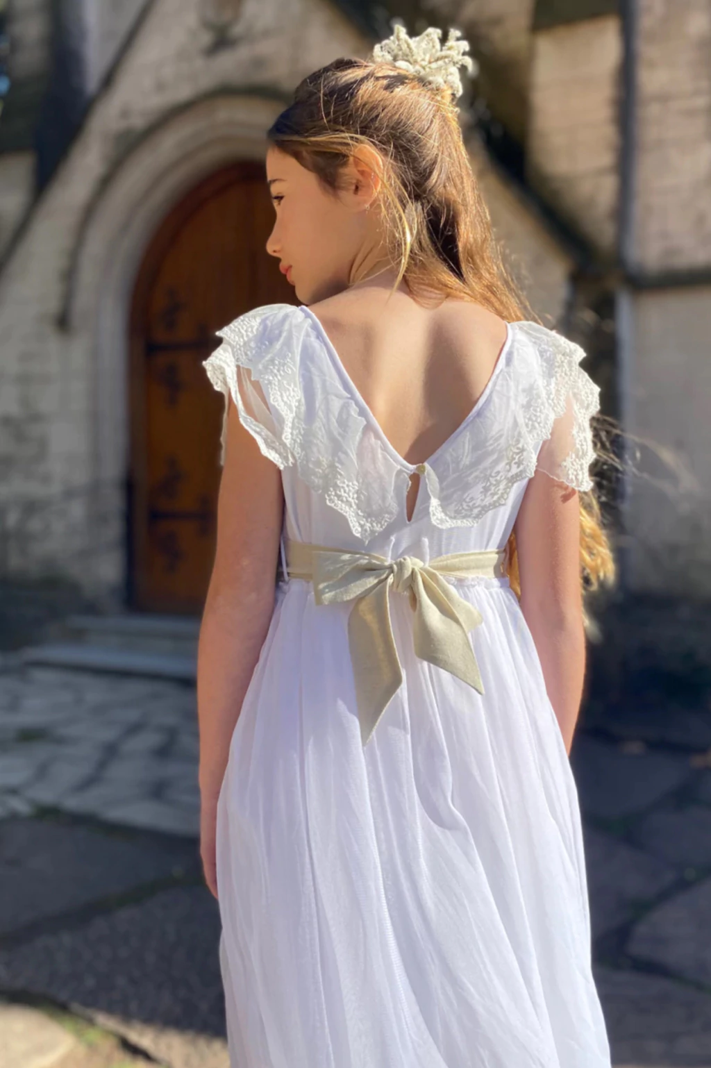 Vestido de tul, con pollera de capas de tul, con volados de puntilla de tul y lazo en cintura